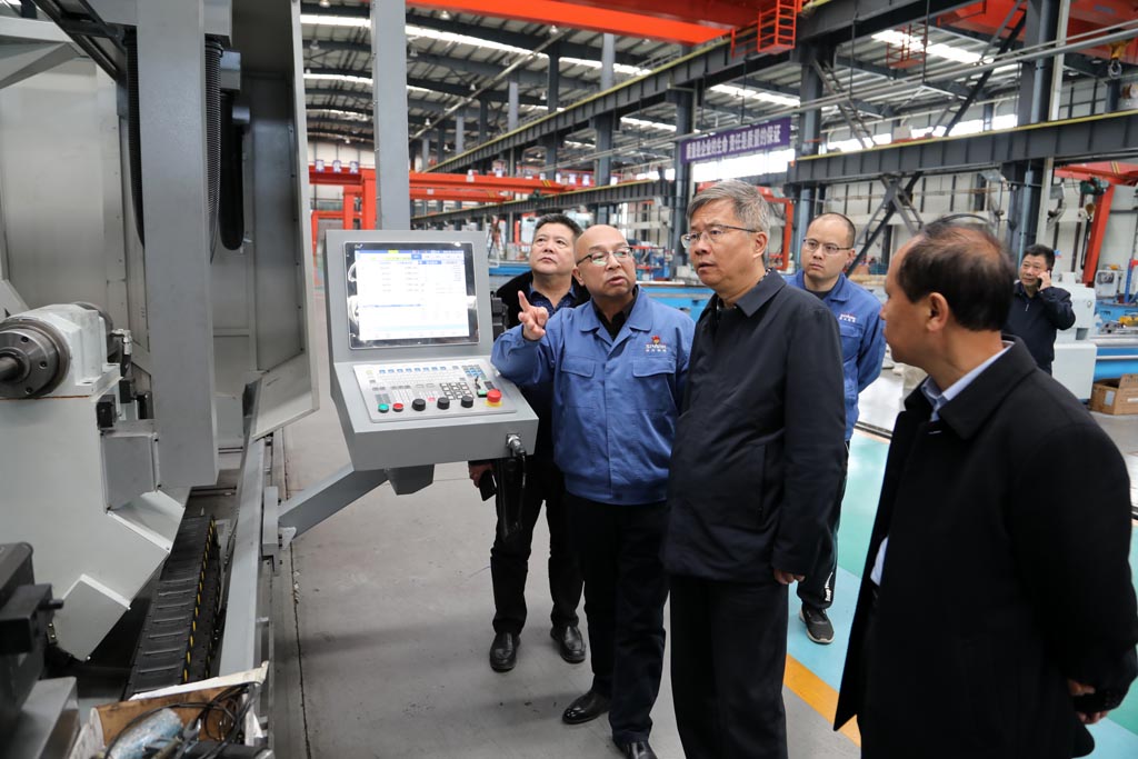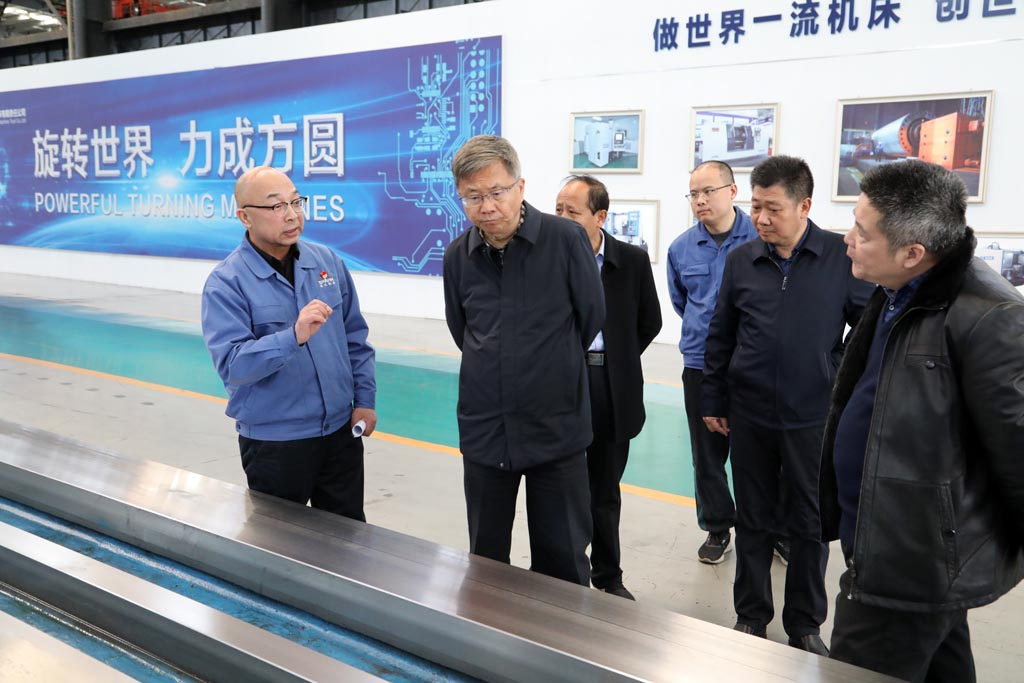 蔣俊、展海瑜陪同李斌一行首先深入工業(yè)園裝配現(xiàn)場,參觀了星火機(jī)床公司研發(fā)生產(chǎn)的大型數(shù)控機(jī)床、重型機(jī)床及星火青重公司生產(chǎn)的車輪車床等產(chǎn)品,介紹了各種機(jī)床產(chǎn)品的特點、用途和市場前景。隨后,前往加工車間參觀了公司主要生產(chǎn)設(shè)備。調(diào)研中,蔣俊匯報了企業(yè)近幾年的生產(chǎn)經(jīng)營指標(biāo)、今年計劃、科技創(chuàng)新、改革改制和未來發(fā)展規(guī)劃等。