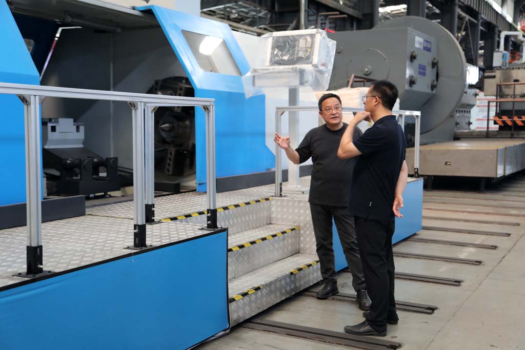 劉建一行在蔣保權(quán)陪同下參觀了工業(yè)園加工車(chē)間和各類(lèi)產(chǎn)品裝配現(xiàn)場(chǎng),向調(diào)研組重點(diǎn)介紹了生產(chǎn)裝配中的數(shù)控重型臥式車(chē)床、車(chē)輪車(chē)床以及五軸聯(lián)動(dòng)機(jī)床等典型設(shè)備,并簡(jiǎn)單回顧了企業(yè)的發(fā)展歷程和歷史沿革。