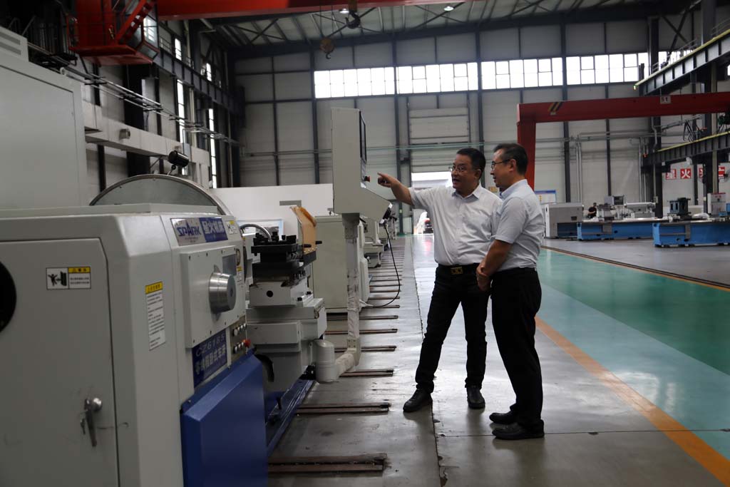 在工業園生產現場,蔣保權向姜鑫一行介紹了企業的歷史沿革,并就企業發展現狀、技術儲備、人才培養等相關問題以及企業精細加工、產品國產化率等進行了交流。蔣保權結合現場的各類機床產品及加工設備,詳細介紹了企業技術研發、市場拓展、科技成果轉化、產業鏈延伸等情況。