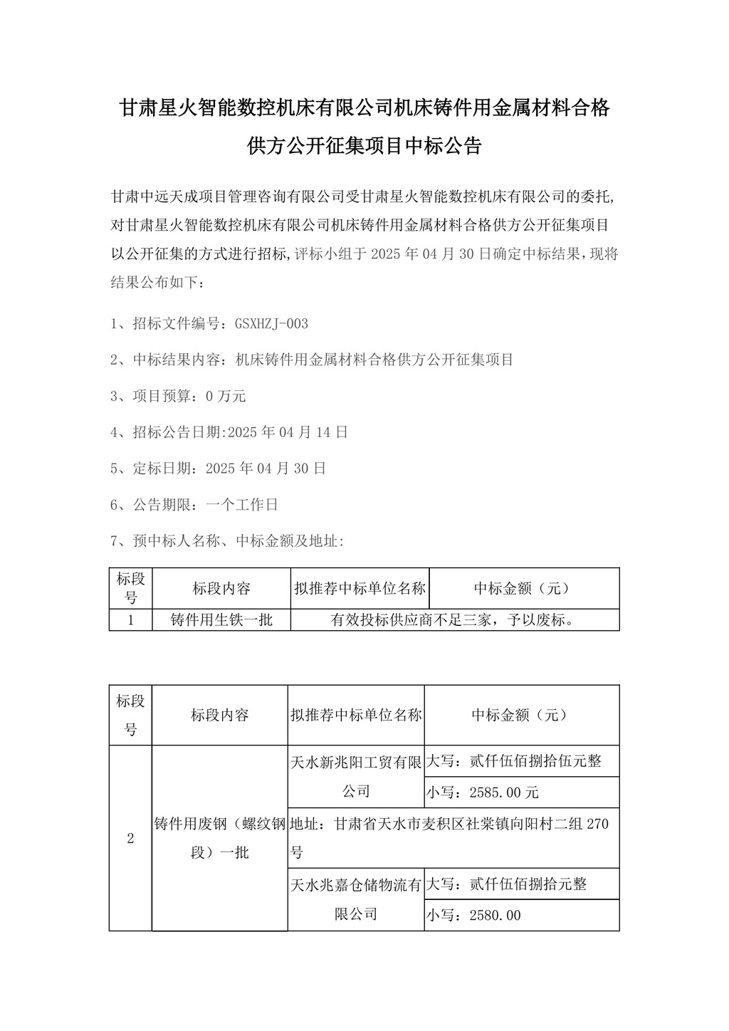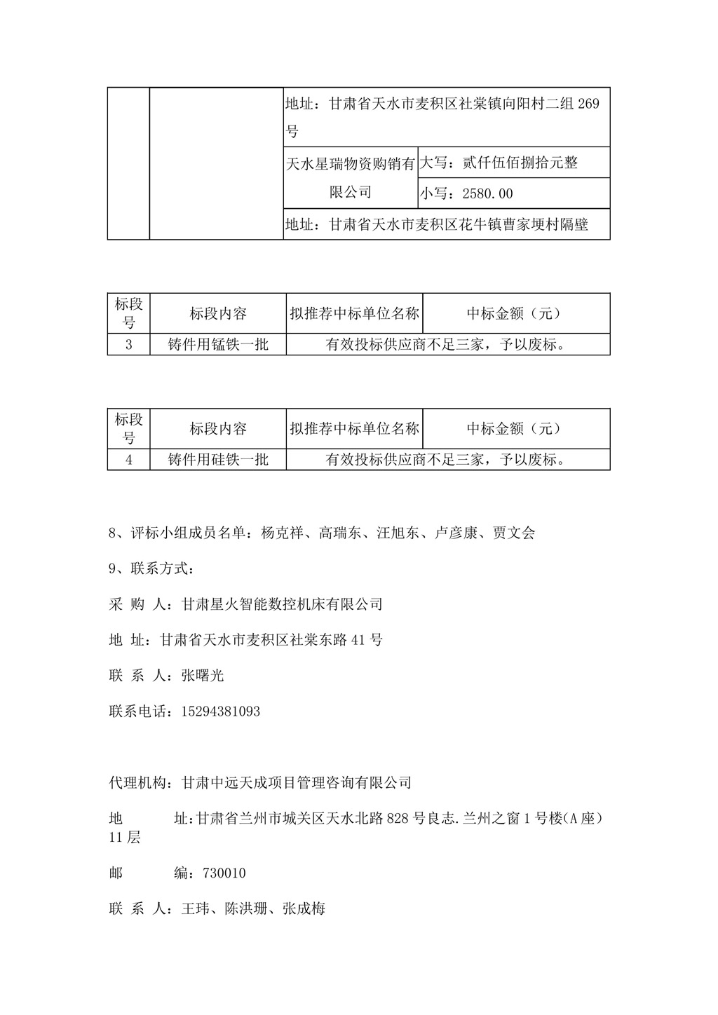 甘肅星火智能數控機床有限公司機床鑄件用金屬材料合格供方公開征集項目中標公告