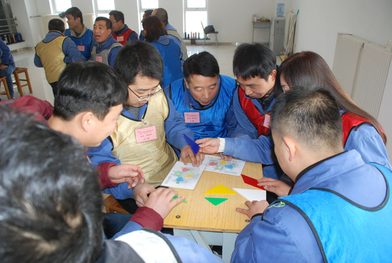 根據老師的要求,50名隊員按1——4循環報數,分為4組,分別穿好紅、黃、藍、銀色馬夾后,開始了熱身游戲。在模擬企業7個部門的梅花型沙盤演練中,全體隊員分為7個小組,以七巧板為道具,按任務書要求必須在最短的時間內完成各自的任務。活動旨在考察并訓練大家的溝通、協調領導能力,以及團隊意識。此時已臨近中午,董事長蔣保權在觀看了活動后講話,闡述了團隊及領導的重要性。