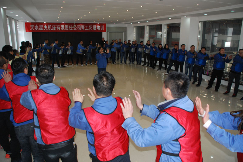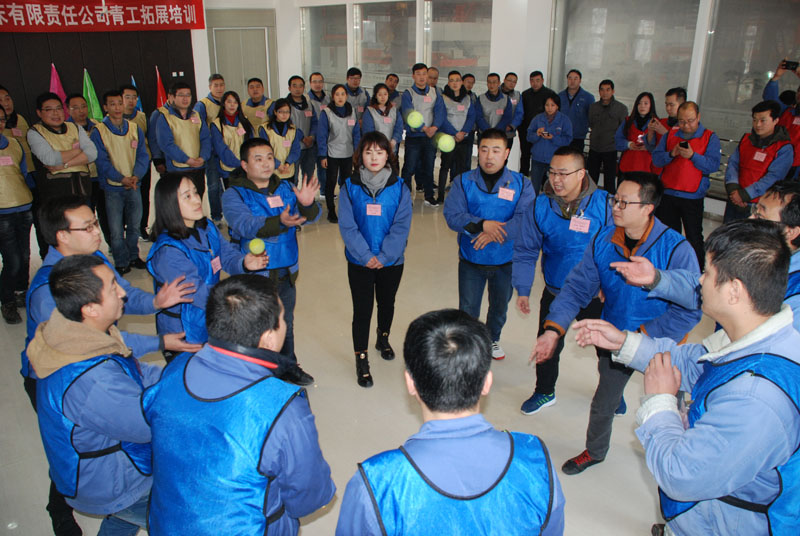 1月12日,銷售部會議室人聲鼎沸,從早上8點到晚上6點20分,一會兒響起高昂有力的口號聲,一會兒響起整齊響亮的吶喊聲。公司邀請的蘭州毅智拓展訓練營的兩位老師正在對公司50名青工進行拓展訓練。集團公司黨委書記、董事長蔣保權,黨委副書記、副總經理、工會主席蔣俊放棄休息,前來觀看訓練。公司總工程師劉強,鑄木分廠廠長張巨宏作為觀察員也早早來到現場,進入工作狀態。工會副主席蔡建欣集合隊員點名之后,交給培訓老師阿杜和海濤帶領,開始了緊張有序的訓練。