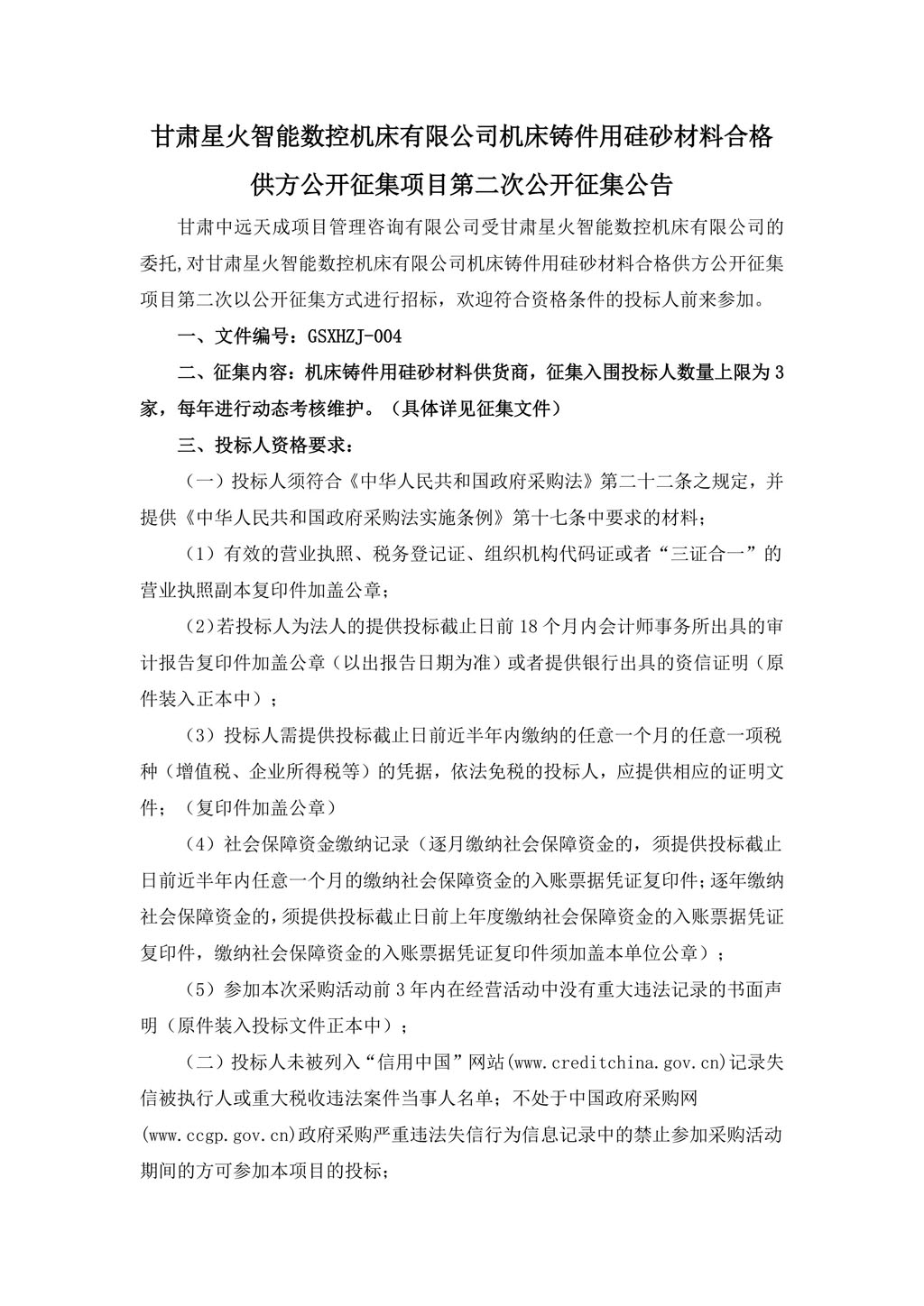 甘肅星火智能數控機床有限公司機床鑄件用硅砂材料合格供方公開征集項目第二次公開征集公告