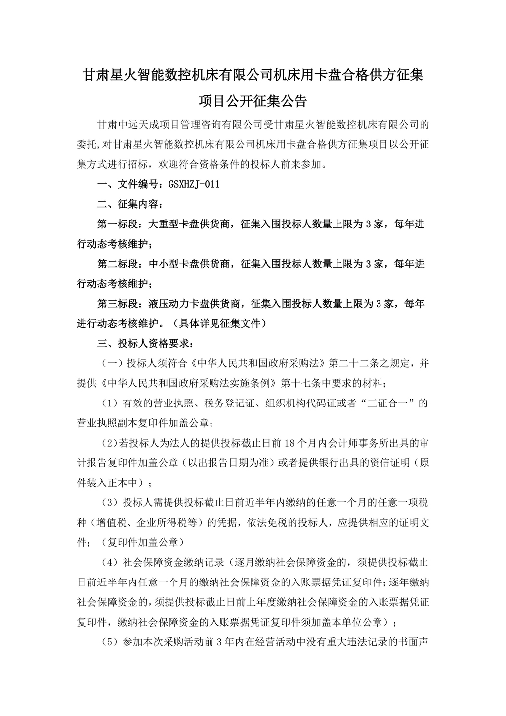 甘肅星火智能數(shù)控機(jī)床有限公司機(jī)床用卡盤合格供方征集項目公開征集公告