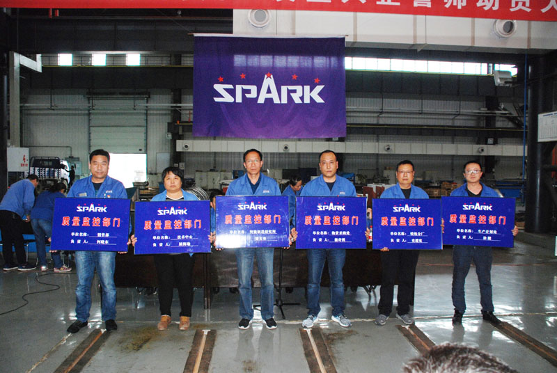 隨后,參會人員先后上臺,面向公司SPARK旗幟列隊,舉起右手宣誓。蔣保權為星火集團及星火機床公司領導領誓。宣誓人齊聲朗誦誓詞:星火品牌,代代傳承,質量根基,全員責任;始于設計,推陳出新;精于工藝,孕于匠心;成于裝配,雕琢精品;立足市場,客戶為尊;勵精圖治,上下同心,星火興亡,我的責任。劉勝、蔣俊分別為各管理部門參會人員領誓。